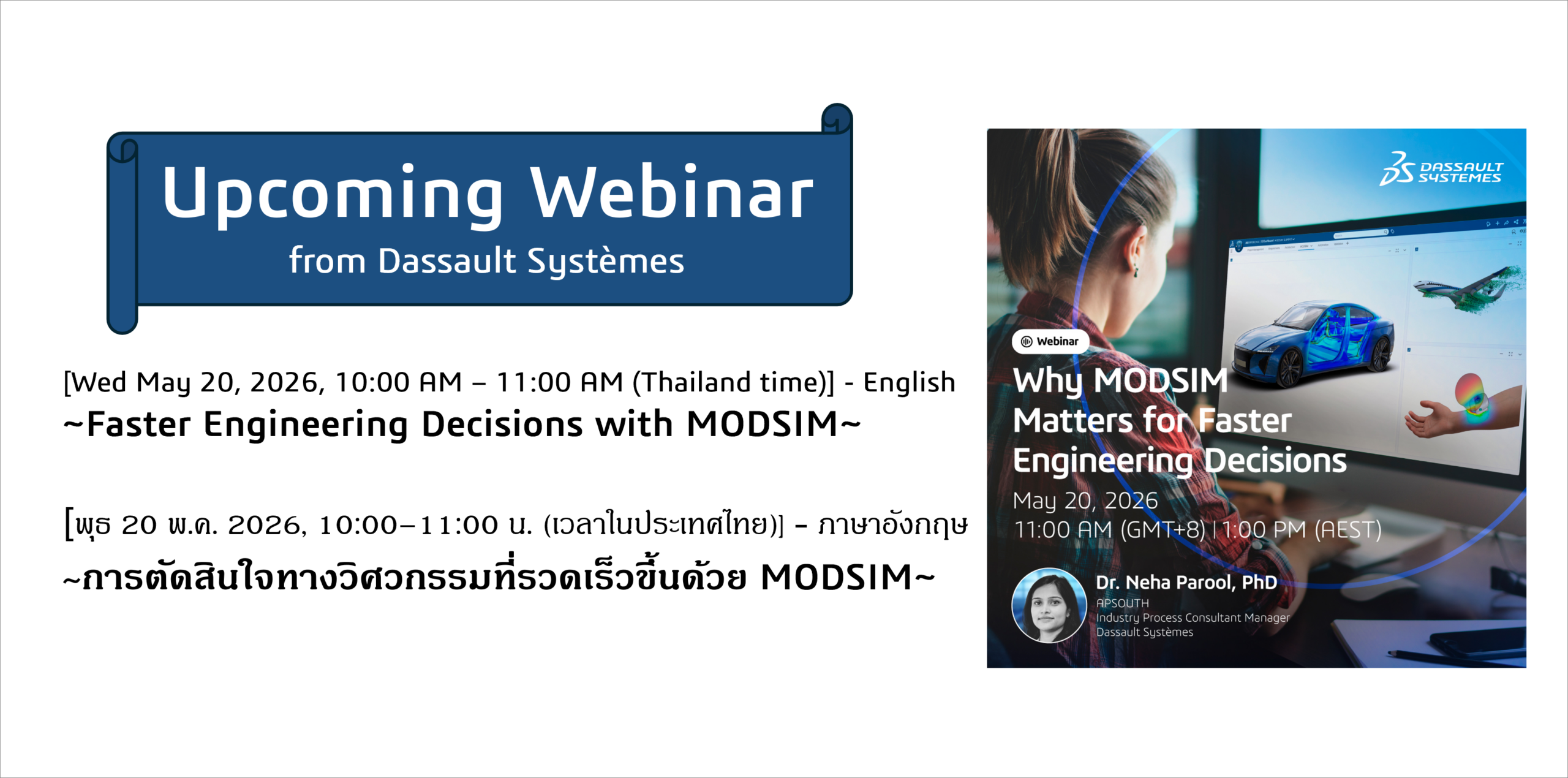 เมื่อผลิตภัณฑ์มีความซับซ้อนมากขึ้นและระยะเวลาการพัฒนาสั้นลง ความท้าทายสำคัญไม่ใช่แค่ความสามารถของระบบอีกต่อไป แต่คือ “ความเร็วในการเข้าถึงและใช้ข้อมูลเชิงลึก” เว็บบินาร์นี้จะแสดงให้เห็นว่า MODSIM ช่วยเชื่อมโยง modeling, simulation และ decision-making เข้าด้วยกันเป็น workflow เดียว ช่วยลดความล่าช้าและเพิ่มประสิทธิภาพในการทำงานของทีมวิศวกรรมอย่างไร